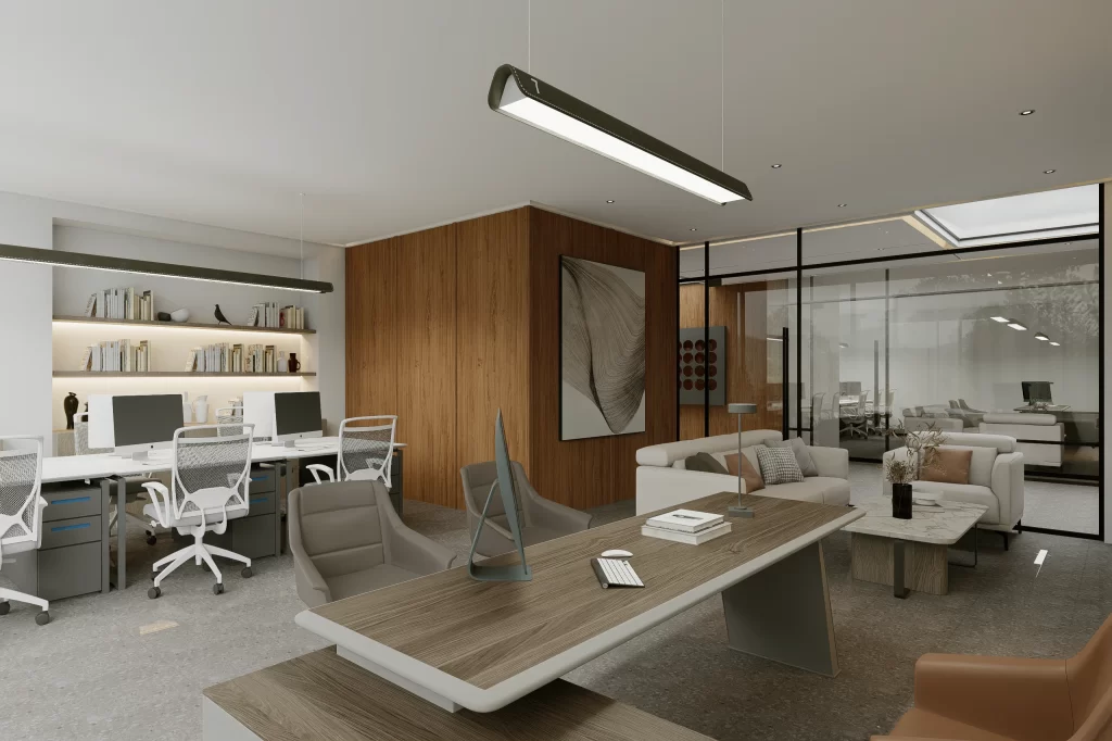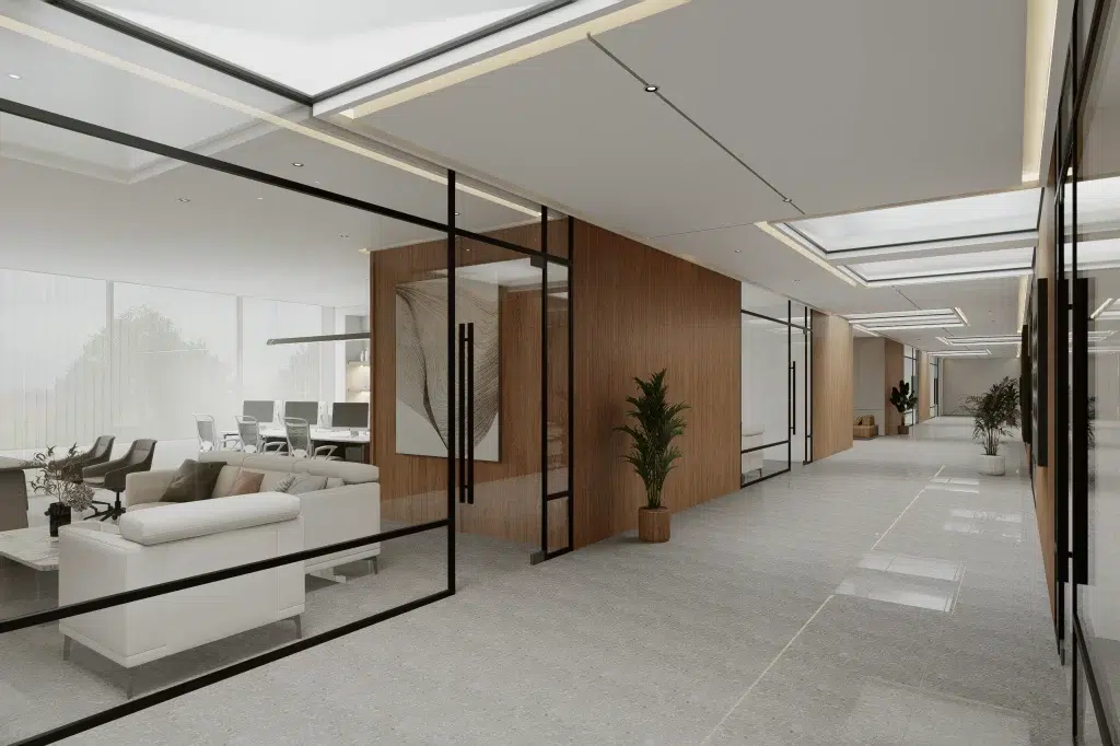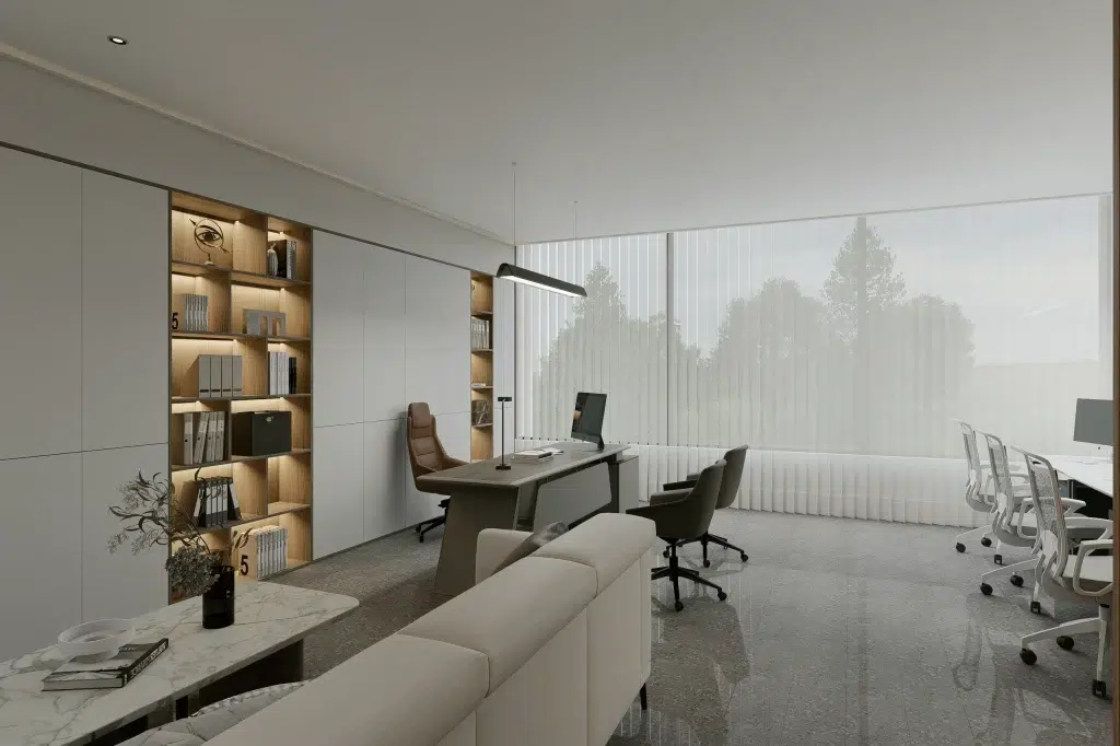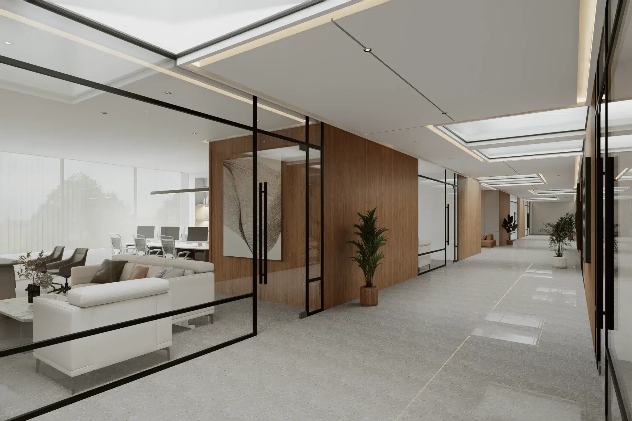 Cada elemento fue pensado para minimizar distracciones y potenciar la claridad mental: circulaciones amplias, superficies continuas y límites transparentes que definen un lugar de trabajo armónico y contemporáneo.